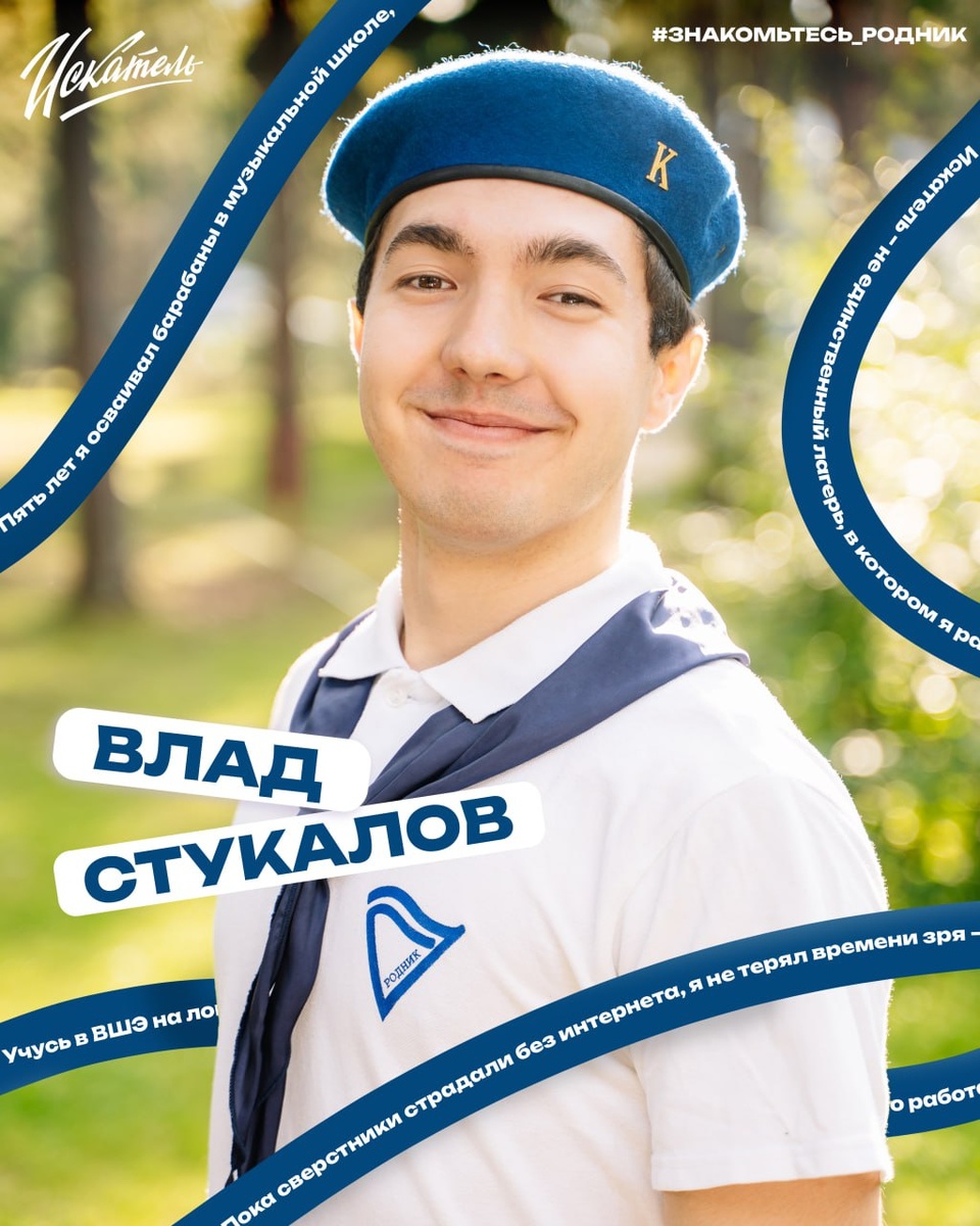 »! 💙 Фактами о себе делится Владислав Стукалов — комиссар, студент, дизайнер… Полный список титулов доподлинно неизвестен даже Владу. ⭕Пять лет я осваивал барабаны в музыкальной школе, когда-нибудь обязательно вернусь к ним и выступлю в «Искателе». ⭕Учусь в ВШЭ на логиста, но работаю дизайнером. ⭕Пока сверстники страдали без интернета, я не терял времени зря — и теперь в «Сапёре» мне нет равных. По крайней мере, среди моих знакомых. ⭕«Искатель» – не единственный лагерь, в котором я работаю, иногда вместе с другими комиссарами «Родника» мы участвуем в организации сборов Русской шахматной школы. ⭕В 7 классе я делал мемы для популярных пабликов в ВК, первую тысячу рублей с них полностью потратил на «Пепси» (Ваня Кретов, привет 👋) Признавайтесь, чем Влад вас удивил, и задавайте оставшиеся вопросы в комментариях! #знакомьтесьродник