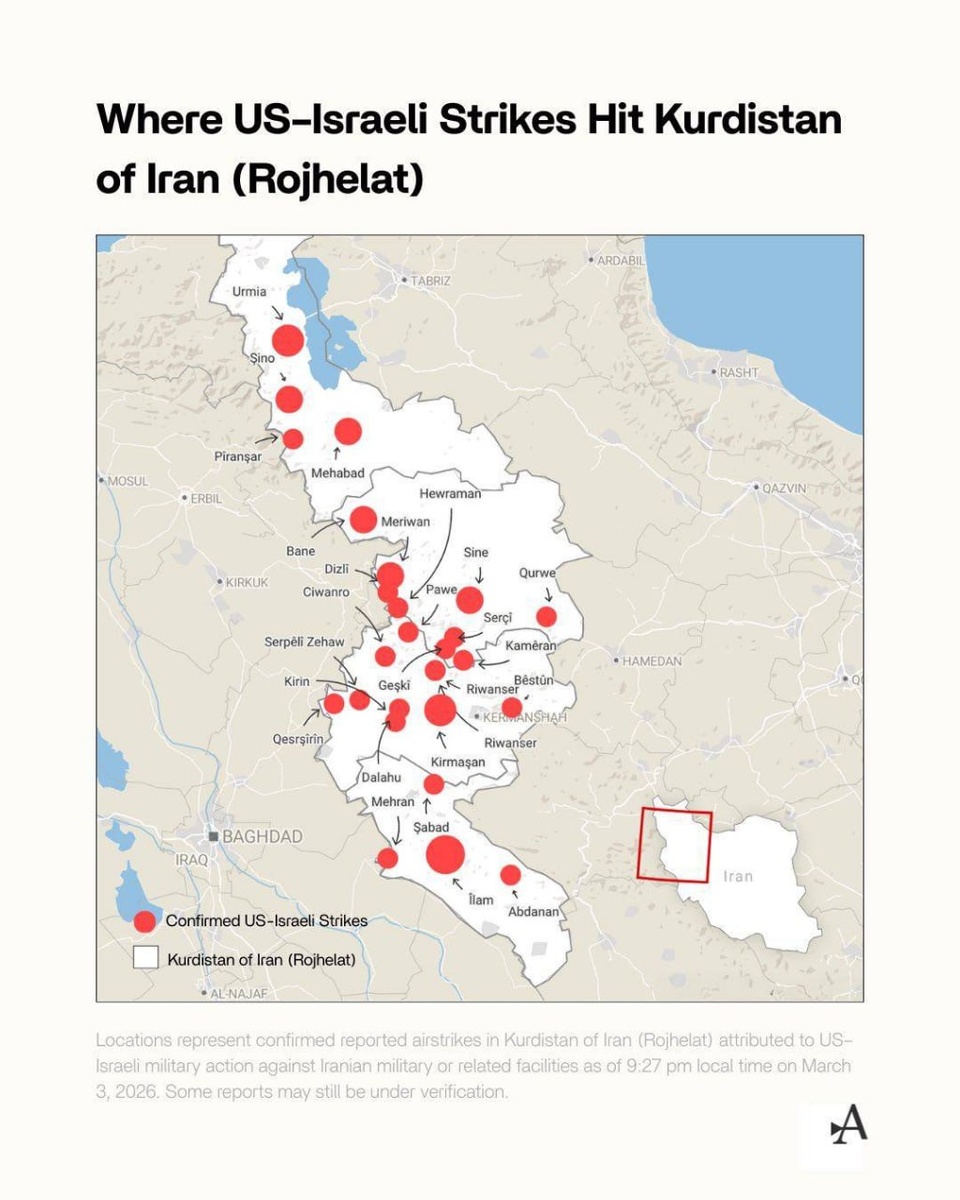 ❗️🗺Авиаудары США и Израиля в основном наносятся по иранским военным объектам в приграничных районах с курдским населением, включая