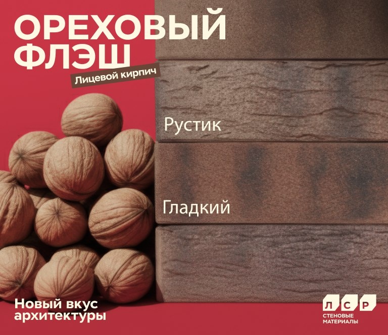 В продаже на нашем🌐 сайте новинка — кирпич «Ореховый Флеш» от ЛСР! Выбирайте настроение фасада: Гладкий — спокойствие и строгость. Рустик — рельеф и «объемный» взгляд. Технические характеристики: 🧱Формат: 1 НФ (250×120×65) 💪Прочность: М175 ❄️Морозостойкость: F100 💧Водопоглощение всего 8% Успейте заказать под свой проект!