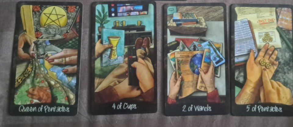? Потому что во время болезни я переключаюсь на свое физическое самочувствие, игнорируя эмоциональные состояния. На 4 кубков, удивительно похожей на реальную обстановку моей комнаты, мы видим персонажа, который смотрит телевизор. Он неактивный, в стогнации. Он сейчас живёт жизнью и эмоциями героев фильмов и сериалов, абсолютно игнорируя свои. Обратите внимание - три реальных кубка стоят под телевизором на комоде. А четвёртый- нарисован. Он ненастоящий. И он в руке персонажа. Нарисованный - значит его не существует. Персонаж обесценивает и отрицает свою эмоцию. Эмоциональное состояние не важно. Фокус внимания на физическом состочнии. Об этом говорит и Королева Пентаклей. Она здесь тоже интересная. Королева шьёт. Руками направляет материал, чётко делает строчку. Она контролирует процесс. И она мать. Чаще всего функциональная. Забота которой может проявляться в материальных моментах - накормить, одеть, полечить. Эмоционально она обычно не включена, что опять нас возвращает в тему