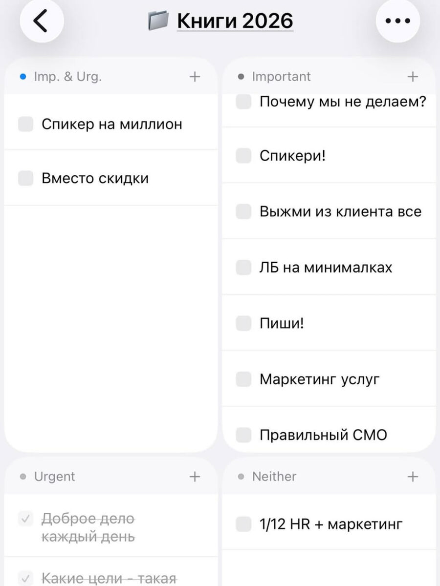 Видишь, что сделано. Что и где тормозится. Делаешь выводы. Обновляешь приоритеты… Одна из моих главных целей на этот год - написать и поставить на книжную полку 12 (!) новых книг. Пять написаны, сданы в издательства. Вышла пока всего одна. Засучиваю рукава ещё выше. Приложение: CoreTask