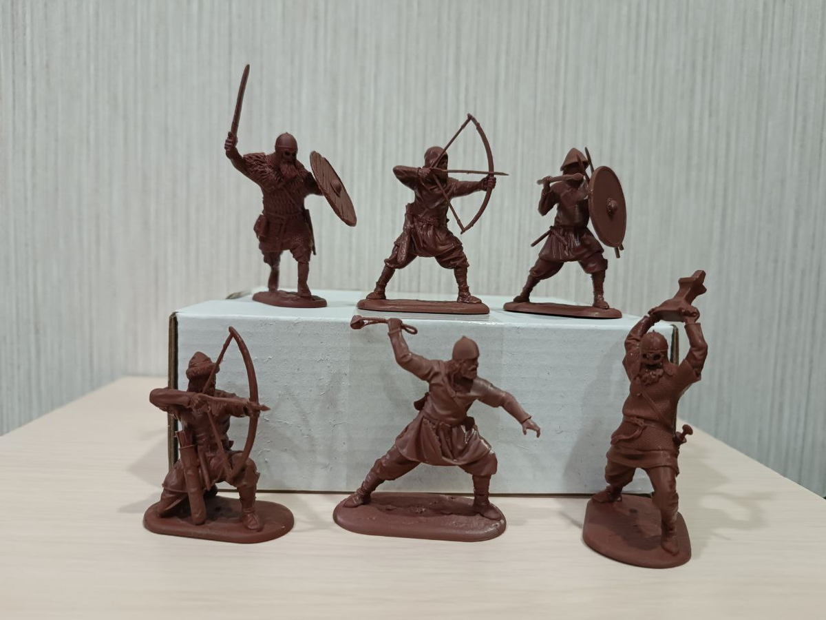 Викингов много не бывает! Ave любители солдатиков! Как известно, викинги и Дикий Запад - это одни из самых популярных тем для коллекции, что мне неоднократно говорили производители ;) Ну, а сегодня Сергей Тарасов покажет и расскажет, какие же викинги пополнили его коллекцию. Фотографии - Анна Тарасова. Представляю набор Викингов Седая Легенда, #6 от TihonFigureN. В наборе 6 фигурок, масштаб 1/32, материал резинопластик. Первая фигурка представляет викинга замахивающегося на противника наковальней. Видимо враг напал внезапно и боец не успел выхватить меч, который весит у него сбоку на перевязи. На голове у воина шлем с полумаской. Из доспехов на нем кольчуга с коротким рукавом. Второй воин в боевой позе. Он бросается в гущу сражения. Вооружен мечом. Так же у него щит, с которым викинг прошел через множество битв. На голове у него шлем с полумаской, на плечах накинута шкура,. Так же как и первый воин облачен в кольчугу. Третий представитель набора лучник. Одет в обычную рубаху. На голову