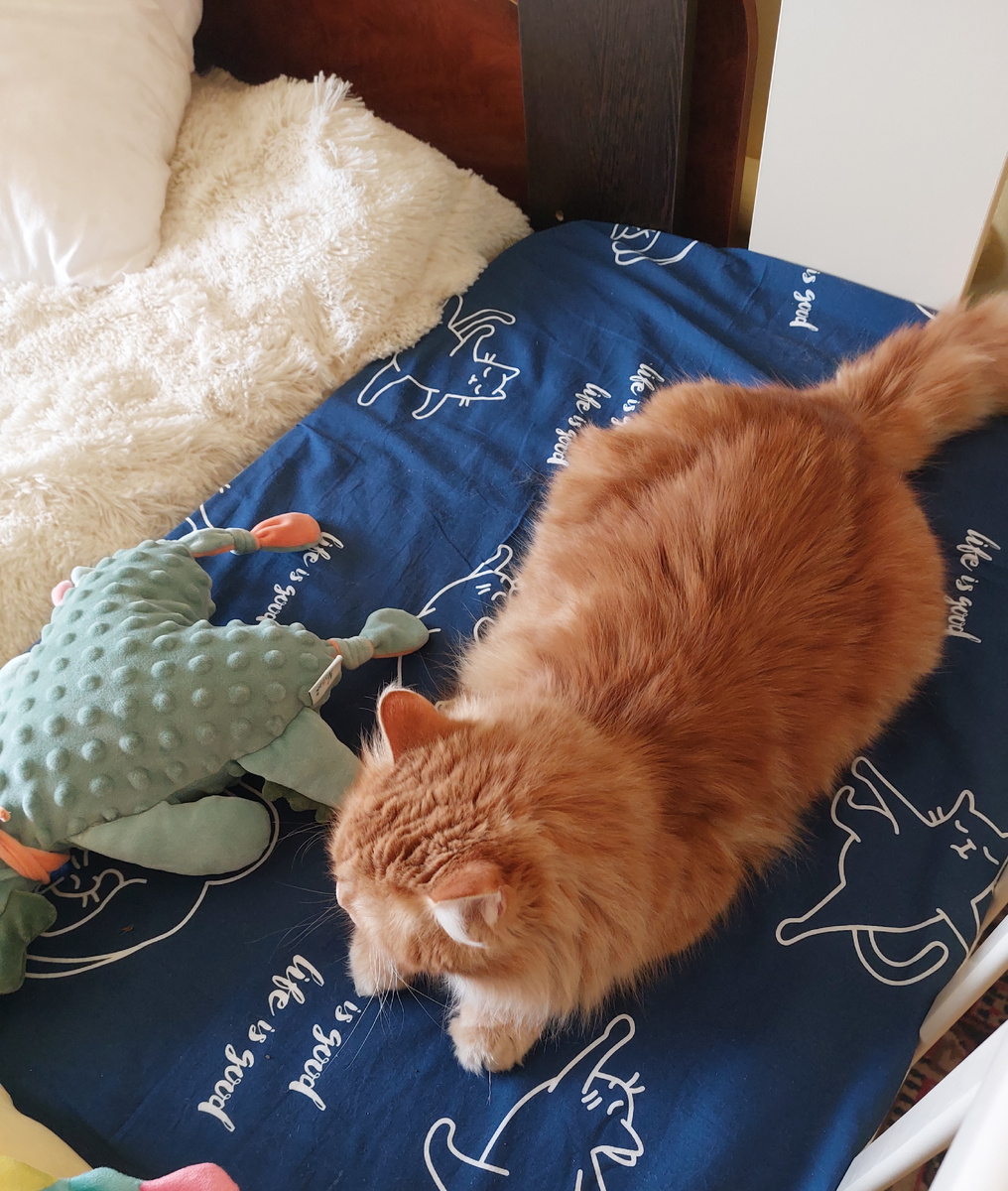 Срочно в номер. Как же я могла пропустить такое событие. Сегодня утром зашла в комнату к дочери, а там наш котик Симба в детской кроватке отдыхает собственной персоной. То ли уединиться захотел, то ли за внуками скучает, то ли в детство впал. Но факт остается фактом. Обычно я дверь в комнаты детей держу закрытой. Чтобы кот не хозяйничал, пока их нет. А тут просто забыла закрыть дверь. И кот тут как тут.