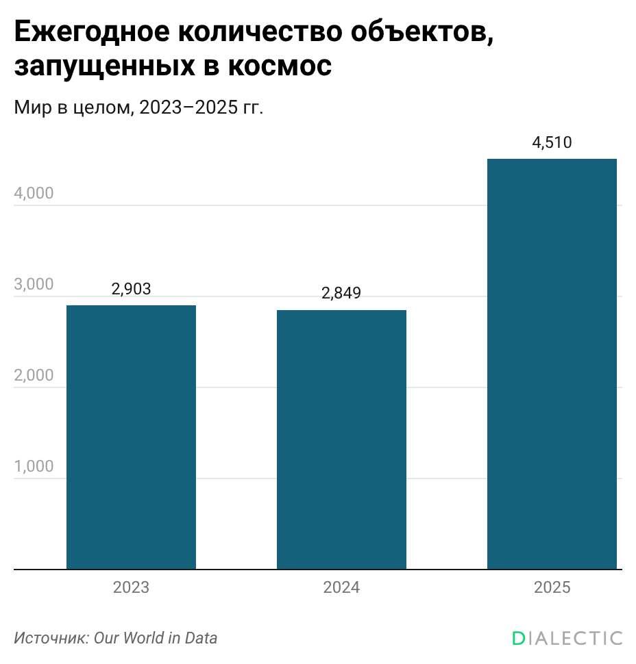 В минувшем году человечество вывело в космическое пространство рекордные 4510 различных объектов. Об этом сообщает исследовательский проект Our World in Data. Абсолютным лидером индустрии стали Соединенные Штаты с показателем 3708 запущенных аппаратов и долей в 82% от глобального объема. Второе место заняла Россия с результатом в 89 объектов. Отечественная космонавтика демонстрирует уверенное наращивание активности на протяжении последних пяти лет. В 2021 году специалисты отправили на орбиту всего 21 объект, а в 2024 году страна достигла локального пика в 97 аппаратов. Итоговый результат 2025 года подтвердил более чем четырехкратный рост отрасли по сравнению с периодом 2021 года. Основной вклад в рост количества спутников на орбите вносят коммерческие спутниковые сети связи. Частные компании массово запускают небольшие аппараты на низкие околоземные орбиты для обеспечения отдаленных регионов планеты высокоскоростным доступом в интернет. Прошлый исторический максимум аналитики фиксирова