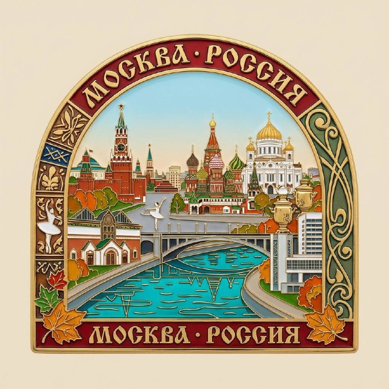 Шаблон промпта: Перегородчатая эмаль и художественная глазурь с металлической текстурой создают сувенирный магнит на холодильник с надписью "МОСКВА · РОССИЯ". В качестве внешней формы магнита используется арочный силуэт, вдохновленный знаменитым Архангельским мостом, с золотым металлическим ободком и рамкой. Композиция изображает знаковые сцены Москвы: Кремль, Красную площадь с Собором Василия Блаженного, Третьяковскую галерею, Храм Христа Спасителя, Сталинградский мост, а также традиционные русские самовары и балетные сценки. Для баланса добавьте осенние желтые листья, отражения на водах Москвы-реки и архитектурные элементы в стиле советского конструктивизма. Декоративные детали: левая сторона украшена мотивом центральной части Третьяковской галереи, правая — орнаментом в стиле модерн, вдохновленным зданиями московского метрополитена. Искусное использование перегородчатой эмали для придания цветовой гаммы: река выполнена в прозрачном насыщенном бирюзовом с золотыми металлическими л