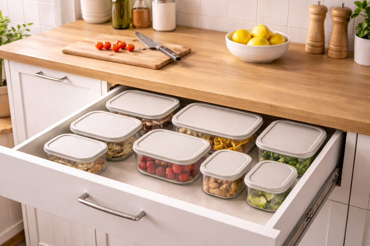 Навёл порядок на кухне за один вечер. Вот что конкретно сделал: Открыл ящик с контейнерами — и закрыл обратно. Потому что найти нужный за разумное время нереально. Круглые, квадратные, без крышек, с чужими крышками, одноразовые от доставки которые жалко выбросить. Классика. Решил разобраться за один вечер. Не глобальная уборка, не перестановка — просто привёл в порядок те места на кухне, которые раздражали каждый день. Вот что сделал и что реально помогло. Вытащил всё из ящика на стол. Принцип простой: каждый контейнер должен иметь крышку прямо сейчас. Не «крышка где-то есть», а вот она, подходит, закрывается. Всё без пары — выбросил. Одноразовые контейнеры от доставки, которые «ещё пригодятся» — выбросил. Контейнеры странных форм которыми не пользовался больше полугода — выбросил. Осталось восемь штук. Ящик стал другим. Ещё одно изменение которое сразу помогло: стал хранить контейнер сразу с надетой крышкой. Раньше складывал отдельно — крышки в одну сторону, контейнеры в другую. Тепе