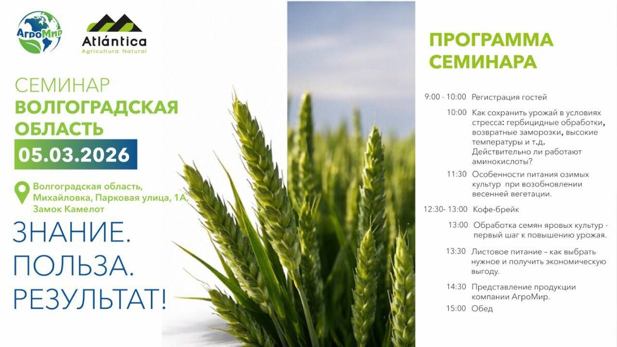 Волгоградская область, г. Михайловка 5 марта приглашаем аграриев региона на практический семинар от АгроМир. Разбираем реальные задачи сезона и конкретные решения для сохранения и увеличения урожайности!☝️ Количество мест ограничено! 📍 Место проведения: г. Михайловка, ул. Парковая, 1А, Замок Камелот 📅 Дата: 05.03.2026 Программа мероприятия: 09:00–10:00 — Регистрация 10:00 — Как сохранить урожай в условиях стресса: гербицидные обработки, возвратные заморозки, высокие температуры 11:30 — Особенности питания озимых зерновых при возобновлении весенней вегетации 12:30-13:00 — Кофе-брейк 13:00 — Обработка семян яровых культур — как заложить фундамент урожайности 13:30 - Листовое питание - как выбрать нужное и получить экономическую выгоду 14:30 — Презентация продукции АгроМир — официальный дистрибьютор Atlantica в РФ 15:00 - Обед Предварительная регистрация: Елена +7 928 968 7477 Ждем вас!