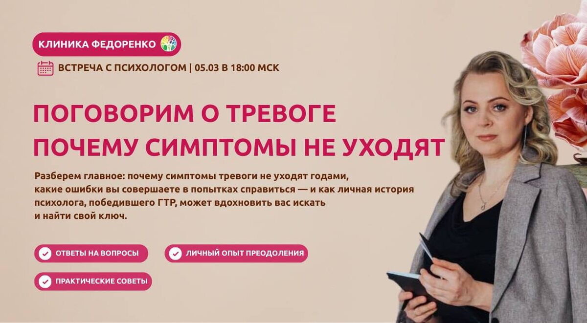 💙💙💙💙💙💙💙💙 Бесплатный вебинар: «Поговорим о тревоге. Почему не уходят симптомы?» 📅 5 марта ⏰ 18:00 (МСК) 💻 Онлайн Ведущая — Наталья Бородина, КПТ-психолог и нейропсихолог. На вебинаре поговорим: 💙почему симптомы тревоги могут долго не проходить 💙что на самом деле поддерживает тревожное состояние 💙что помогает начать выход из тревоги Наталья разберёт механизмы тревоги простым языком, поделится своим опытом преодоления и ответит на ваши вопросы. Участие бесплатное. Ссылку для подключения направим завтра. Присоединяйтесь, чтобы лучше понять своё состояние и найти то, что поможет именно вам.