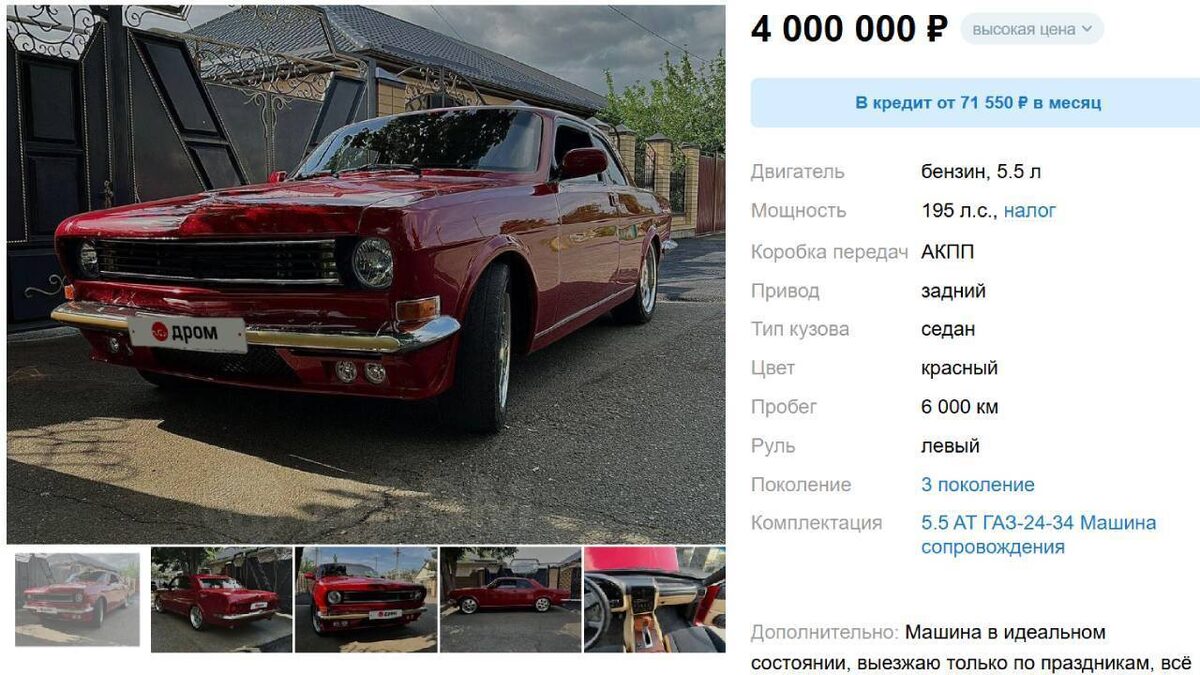 На одном из популярных классифайдов появилось объявление о продаже советского 38-летнего седана ГАЗ-24-34 в версии КГБ с пробегом 6000 км. Автомобиль был выпущен ограниченным тиражом, который составлял 244 единицы, а именно этот экземпляр ещё и пережил глубокий тюнинг. Машина находится в Ставропольском крае, сообщает портал 110km.ru. Машина была построена на базе ГАЗ-13 «Чайка», а внешне такие машины не отличались от серийной «Волги». Под капотом же здесь устанавливался 5,5-литровый V8 на 195 л. с., работающий в связке с 3-ступенчатой автоматической трансмиссией. Кстати, в салоне при этом могло находиться три педали, но две из них работали как тормоз. Также н аседан устанавливалась усиленная подвеска, более мощные тормоза, стабилизатор поперечной устойчивости и гидроусилитель руля. Впрочем, машина, которая выставлена на продажу, пережила глубокий тюнинг. Оригинальный двигатель был заменён на 3,0-литровый рядный мотор Toyota, выдающий 230 л. с., сочетается с которым 4-диапазонный «автом