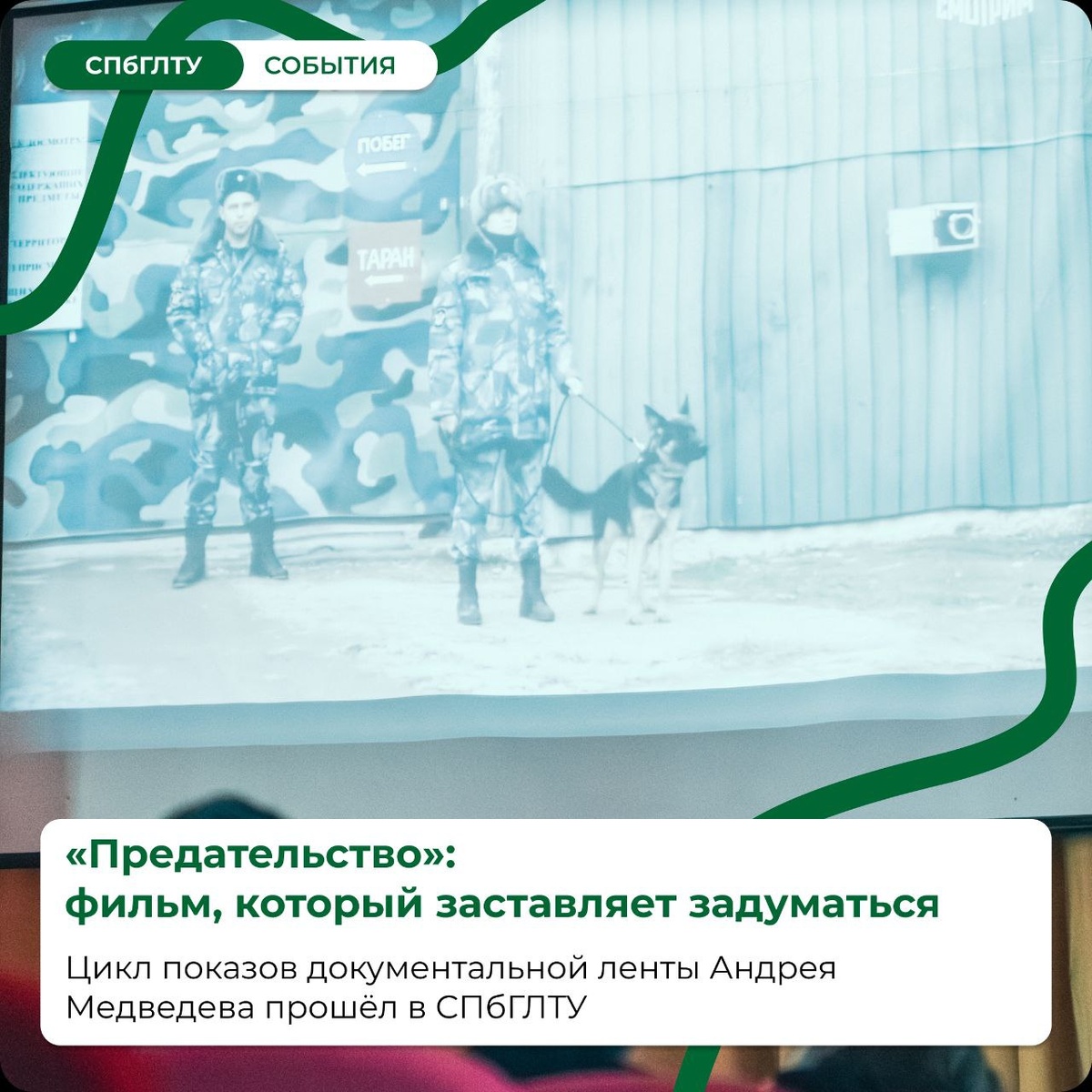 » В Санкт-Петербургском государственном лесотехническом университете прошел цикл показов фильма «Предательство». Автор фильма — заслуженный журналист Российской Федерации Андрей Медведев. 🎬 Фильм посвящен судьбам молодых граждан России, которые совершили преступления против конституционного строя и безопасности нашего государства в период специальной военной операции. В ходе повествования автор задает прямые вопросы героям ленты. Главная цель фильма — проанализировать причины, по которым молодые люди поддались на установки иностранных спецслужб и решились на пособничество врагу собственного народа. 🚩 На конкретных примерах зрители увидели, как через манипуляции и ложные лозунги молодежь вовлекают в подготовку терактов и диверсий против Российской Федерации. Для студентов университета этот показ стал важным уроком гражданской бдительности и ответственности за свои поступки перед законом и Родиной. #СПбГЛТУ #СПбГЛТУ_события 👻 МАХ | 💙 ВК | 📝 ДЗЕН