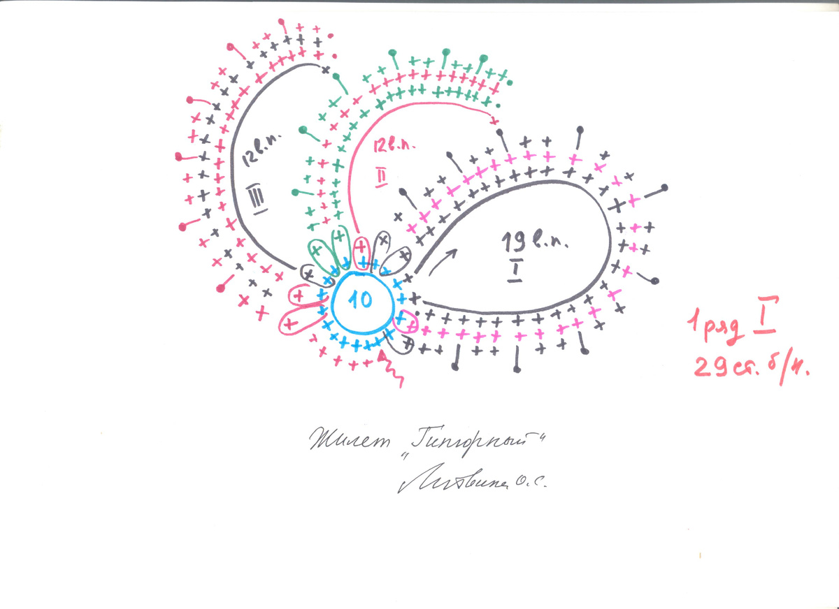 Жилет состоит из отдельно связанных гипюрных фрагментов. Фрагменты сшиваются между собой иголкой с ниткой. в соответствии с выкройкой.