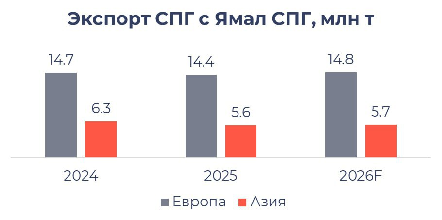 ЕС планирует отказаться от российского СПГ с января 2027 г., а от трубопроводного газа – с 30 сентября 2027 г. Рассмотрим подробнее, что может быть с экспортом СПГ из России в 2027 г. и как это повлияет Новатэк. ЕС, вероятно, с 2027 г. заменит российский СПГ на поставки из США и Катара По данным Bruegel, в 2025 г. экспорт российского СПГ в ЕС составил 19.9 млрд куб. м, а экспорт трубопроводного газа – около 18.1 млрд куб. м. Доля России в общем объеме импорта газа в ЕС снизилась с 18.3% в 2024 г. до 12.1% в 2025 г. Всего объем импорта газа в ЕС в 2025 г. снизился на 5% до 313.6 млрд куб. м. Импорт трубопроводного газа составил 169.9 млрд куб. м (54.2% от всего импорта), СПГ – 143.7 (45.8% от всего импорта). Вероятно, что в 2027 г. ЕС будет заменять поставки российского СПГ на импорт из США и Катара, которые планируют увеличить производство и экспорт сжиженного газа. США сейчас планируют увеличить экспорт СПГ с 156 млрд куб. м в 2025 г. до 170 млрд куб. м в 2026 г. и до 189 млрд куб. м