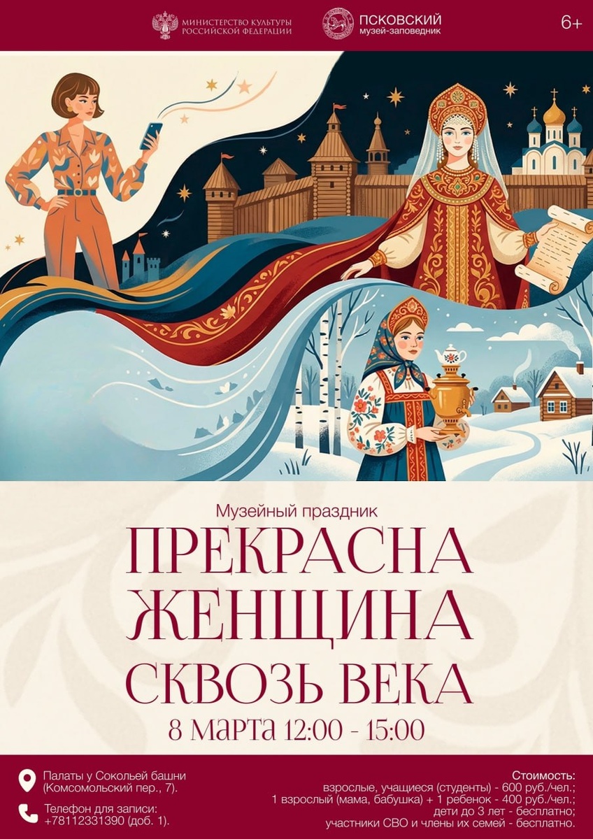 » 🪆 🖇 Гостей ожидает разнообразие творческих площадок, экскурсия и викторина. На тематической экскурсии по Палатам посетители узнают об интерьере русской крестьянской избы, средневековых секретах стиля и красоты, а также примут участие в игре-викторине о повседневных женских заботах, традиционной кухне и праздниках по «Домострою». На мастер-классах каждый сможет своими руками создать праздничный сувенир – бусы из ткани, обережную куклу или открытку в стиле XIX века. 📆 8 марта с 12:00 до 15:00. 📍 Комсомольский пер., д. 7. 🎟 Стоимость: взрослые и учащиеся (студенты) – 600 руб./чел., 1 взрослый (мама, бабушка) и 1 ребенок – 400 руб./чел., дети до 3 лет – бесплатно, участники СВО и члены их семей – бесплатно. Оставайтесь с нами #НашаПсковскаяобласть