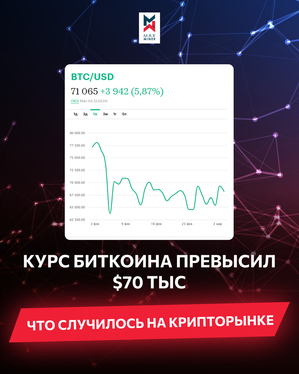 Биткоин снова тестирует уровень $70 000 Курс BTC замедлено превысил отметку $70 тыс. и составляет на данный момент ~ $71 500 Что произошло: