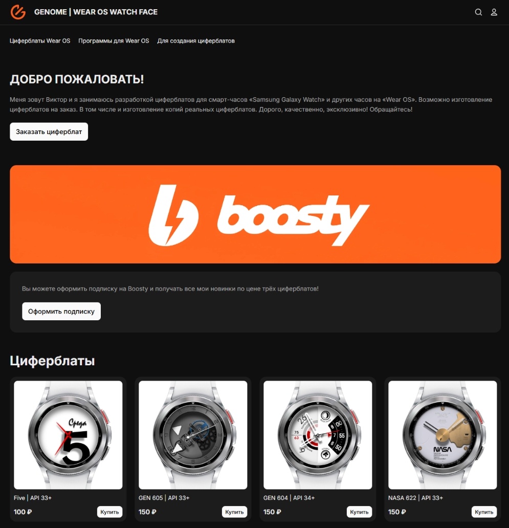 Всем привет! Наконец-то я нашёл время и разобрался на всех своих площадках. Теперь всё удобно и, надеюсь, будет понятно. Приступим! Обновился основной магазин. Теперь это тёмная тема и оранжевые цвета. Картинки товаров теперь квадратные, что для просмотра циферблатов удобнее. Добавлены - ссылка на Бусти и кнопка для обсуждения деталей циферблата на заказ. Да, я снова принимаю заказы. Дорого, качественно, эксклюзивно. Вторая новость - запуск удобного магазина на Бусти. Кто не знаком с этой площадкой, объясню. На Бусти можно покупать мои циферблаты как в розницу, так и оптом. Если вы фанат циферблатов и любите их менять чуть ли не ежедневно, ваш выбор - это подписка. За небольшую сумму получаете доступ ко всем новинкам и радуетесь жизни. Причём, если сравнивать с популярными сегодня закрытыми каналами в ТГ, то тут вы сразу видите за что платите, а не получаете кота в мешке. Посмотрели витрину и сразу поняли что для вас будет выгоднее - купить один-два циферблата в розницу или оплатить вс