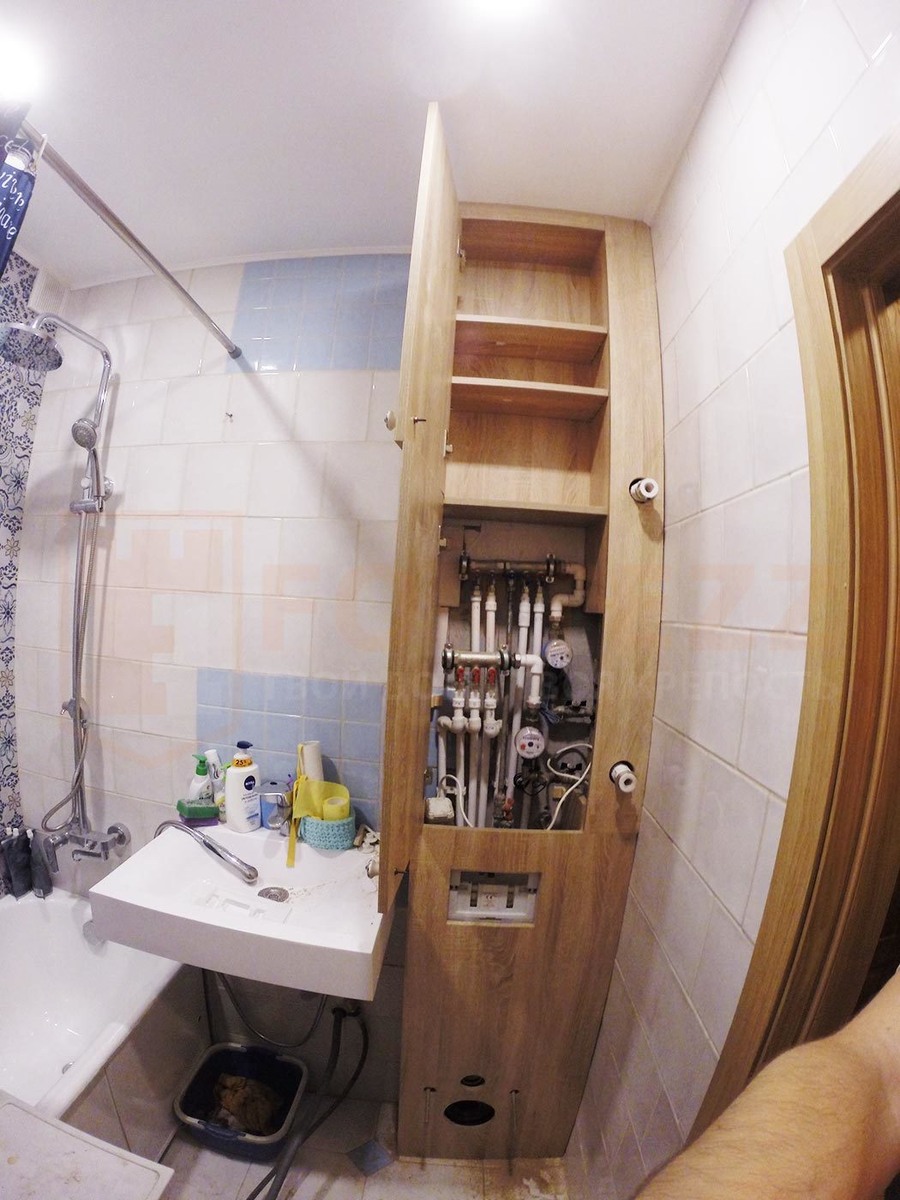 Современные дизайн проекты зачастую предусматривают смелые нестандартные решения с использованием различных материалов в комбинации. На данном объекте заказчица попросила выполнить короб из лдсп в сантехническом узле. Конструкция данного шкафа дсп подразумевает сокрытие установленной инсталляции для унитаза и декорирование канализационных труб, путём обшивки их коробом из ЛДСП. Данная ванная имеет небольшие размеры и было принято решение делать короб именно таким способом. Чаще же подобная конструкция возводится из стальных направляющих и обшивается гипсокартоном, а затем уже создаётся декоративный слой. Такое решение в данном случае было обусловлено габаритами помещения и желанием сделать подобный короб максимально функциональным. ЛДСП, применённая в изделии имеет цвет Дуб Сонома, толщину 16 миллиметров и кромку ПВХ 2мм. Данный материал не является абсолютно влагостойким и был выбран на свой страх и риск, однако при соблюдении условий постоянной вентиляции и циркуляции воздуха прослу