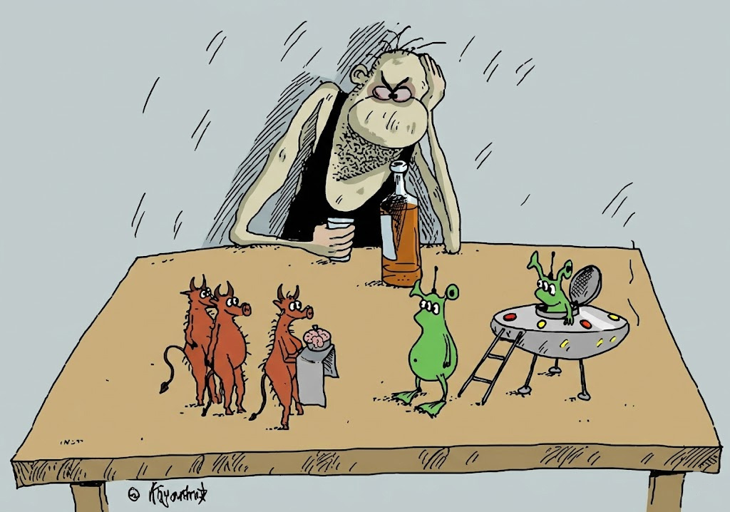 Секрет Булатова в том, что он не пытается быть умным. Звучит как оскорбление, но на самом деле это комплимент. Он не строит сложные аллегории, не прячет три слоя смысла в одном рисунке, не ждёт, что зритель будет расшифровывать послание с энциклопедией в руках. Его карикатуры понятны сразу. Открыл — увидел — засмеялся. Всё.