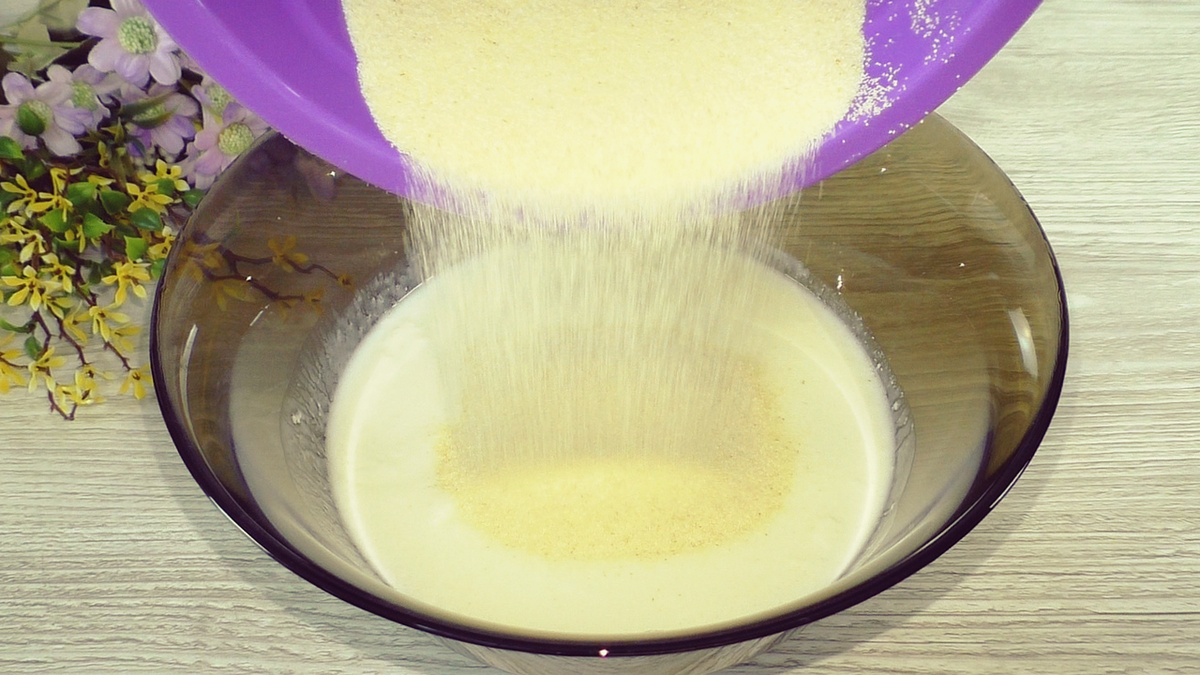 Кефир использую тёплый, всегда предварительно его немного подогреваю в микроволновой печи. В кефир отправляю манную крупу, перемешиваю и даю постоять 15 минут, не дольше.