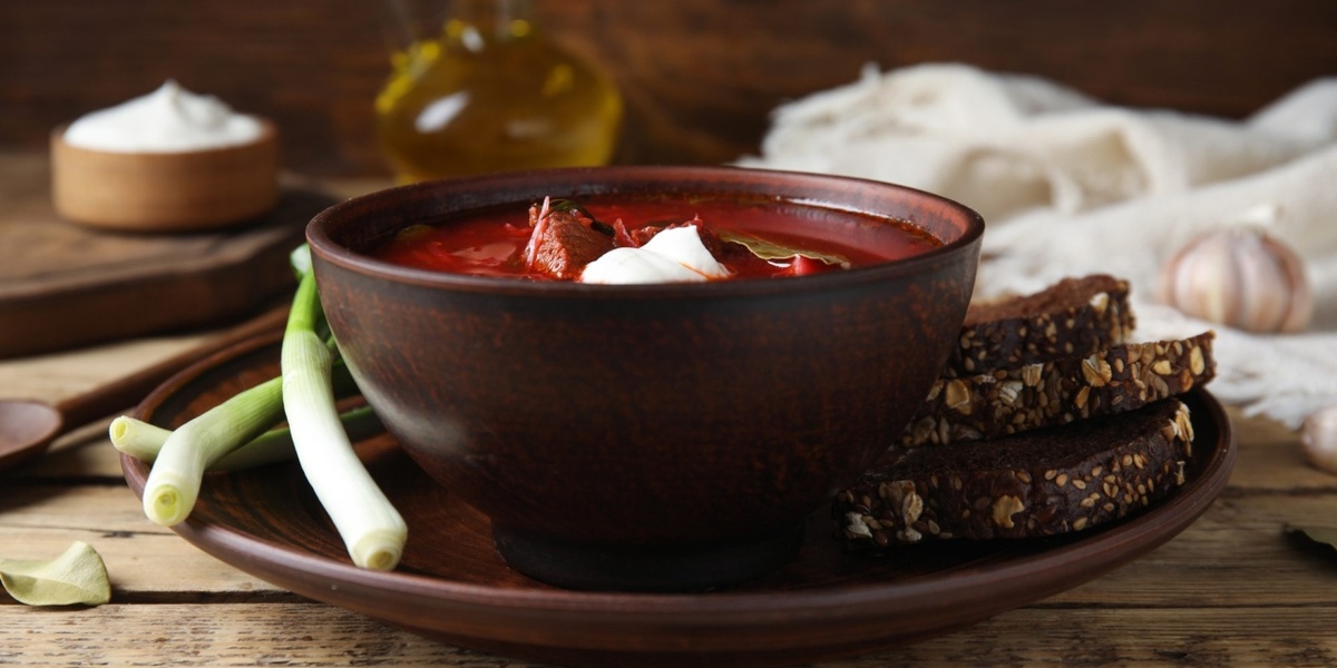 Добавьте красный винный уксус и лимонный сок — они подчеркнут цвет и вкус свёклы. Доведите до кипения, затем уменьшите огонь и варите 1,5–2 часа на слабом кипении. За 10–15 минут до готовности добавьте измельчённую свекольную ботву (если используете). Подавайте суп горячим: ✔ насыщенный мясной вкус