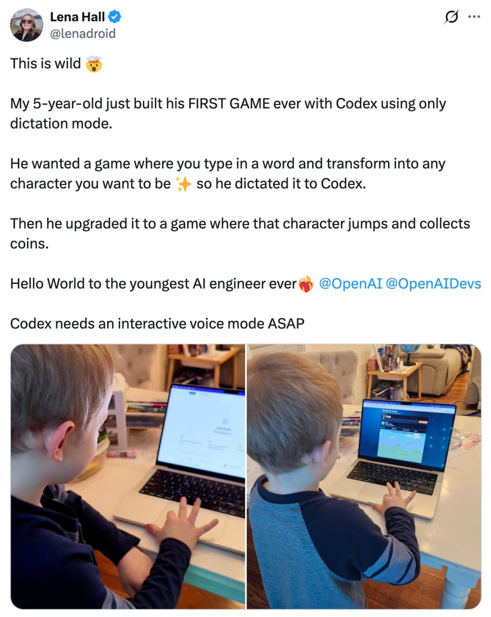 5-летний вайбкодер создал свою первую игру с помощью Codex, не прибегая к написанию промтов — ему хватило простой диктовки