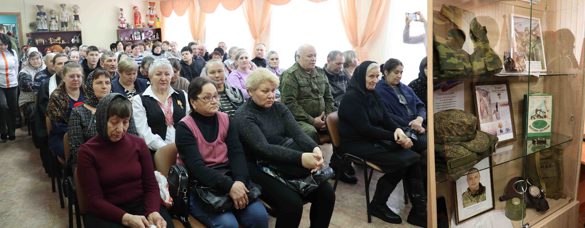 После официальной части, завершившейся небольшим патриотическим концертом, подготовленным солистами РДК, состоялась первая экскурсия в музейную комнату, которая едва вместила всех родных погибших героев. Здесь были и матери, и отцы, и вдовы, и дети, бабушки, сестры, которые со слезами на глазах рассматривали лица своих родных, увековеченных на стенде памяти, разглядывали личные вещи других ребят. Экскурсию провела Людмила Галкина, которая рассказала о каждом экспонате. Экспозиция пока не очень большая, часть вещей передали семьи Слугиных, Кипайкиных, Игошиных, Кузьминых, Шунчевых, Куликовых, Гужиных, Китайкиных, Ивановых, Маловых, Воробьевых. Среди экспонатов – копии писем Григория Слугина, солдатская форма Максима Куликова и Антона Игошина, банковская карта, пробитая пулей, принадлежавшая Дмитрию Гужину, противогаз и фляжка Евгения Иванова, головные уборы Александра Кипайкина и Валерия Кузьмина, жилетка-разгрузка Георгия Воробьева, его же школьная тетрадь и дневник, любимые книги о войне, которые читали Алексей Кузнецов и Иван Малов, медали и дипломы за успехи в состязаниях по вольной борьбе, которой занимался Николай Китайкин и т.д. Большую помощь в сборе вещей оказали сельские библиотекари, которые обращались к родным ребят. Напомним, что параллельно такая же работа по увековечиванию памяти о погибших участниках СВО ведется и в краеведческом музее, куда также передавались вещи, так что и там есть что посмотреть. Здесь же, в музейной комнате, место нашлось и письмам школьников, адресованным защитникам Отечества, их рисункам на патриотическую тему. Сотрудники библиотеки также собрали весь цикл материалов, посвященных погибшим героям, которые были опубликованы в газете «Маяк». Думается, что у каждого, кто останавливался возле снимков, газетных публикаций, в голове мелькала одна мысль: чтобы не дополнялась эта стена новыми фотографиями, чтобы быстрее наступил мир, и наши земляки вернулись домой, к своим семьям. В память же об убиенных воинах краткую панихиду отслужил настоятель храма с. Кученяево о. Евгений (Кириндясов).