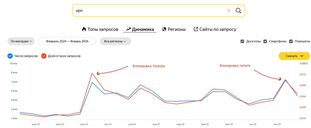 и т.п. По факту, самое неприятное то, что регулятор учит подрастающее поколение как ...игнорировать регулятора :( и находить лазейки. А на картинке всплески интереса к ВПН по мере блокировок популярных сервисов. Я за отечественные решения, вопросов нет, но ведь и решений толковых тоже нет :( а если они и есть, то там нет аудитории... Русский ИТ бизнес +✅Мы в MAX