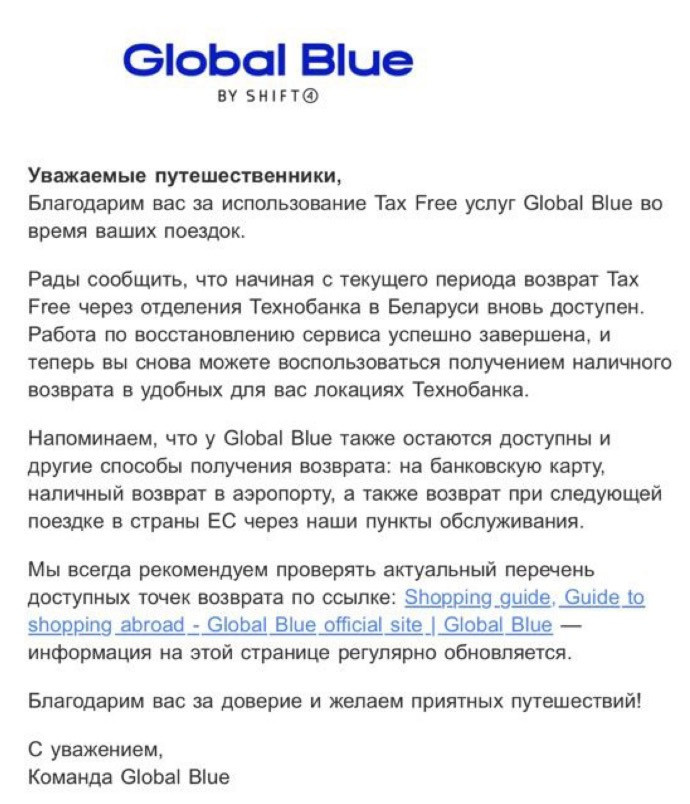В Беларуси снова станет доступен возврат НДС по чекам Global Blue через отделения «Технобанка». Об этом компания сообщила пользователям сервиса. В письме для клиентов говорится, что сервис уже восстановлен и путешественники снова могут получать наличный возврат Tax Free в отделениях банка. Также остаются доступными и другие способы возврата — на банковскую карту, наличными в аэропорту или при следующей поездке в страны ЕС через пункты обслуживания Global Blue. Напомним, осенью прошлого года выплаты по чекам Global Blue в «Технобанке» были приостановлены. Тогда компания сообщала, что возврат НДС временно прекращается из-за изменений в операционных процессах, которые затронули совместную работу с банком. Есть о чем рассказать? Пишите в наш телеграм-бот. Это анонимно и быстро