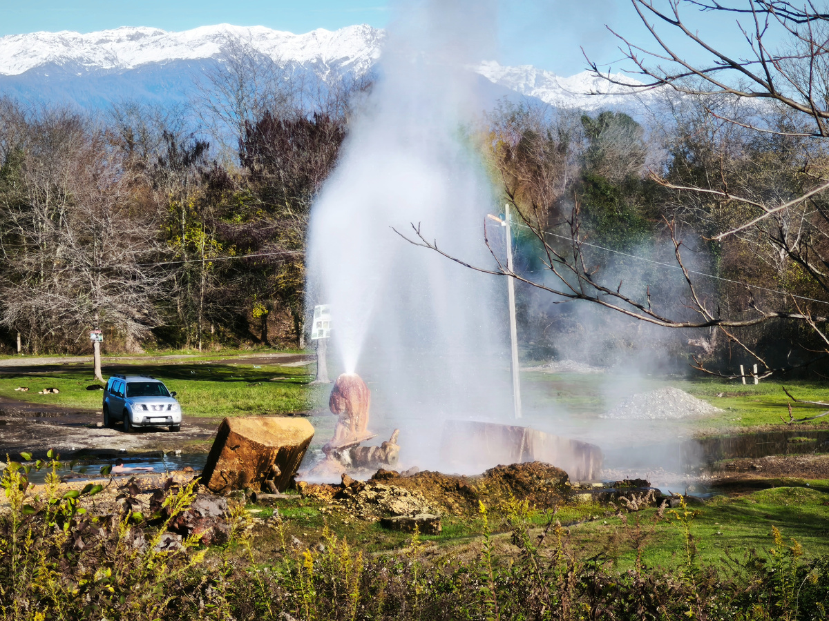 Едем дальше. Прям с дороги увидели вот такой источник с фонтаном! Коровами на дорогах не удивишь, но вот буйволов вижу впервые!! А тем временем мы доехали до Ткуарчала - почти заброшенного шахтерского города.