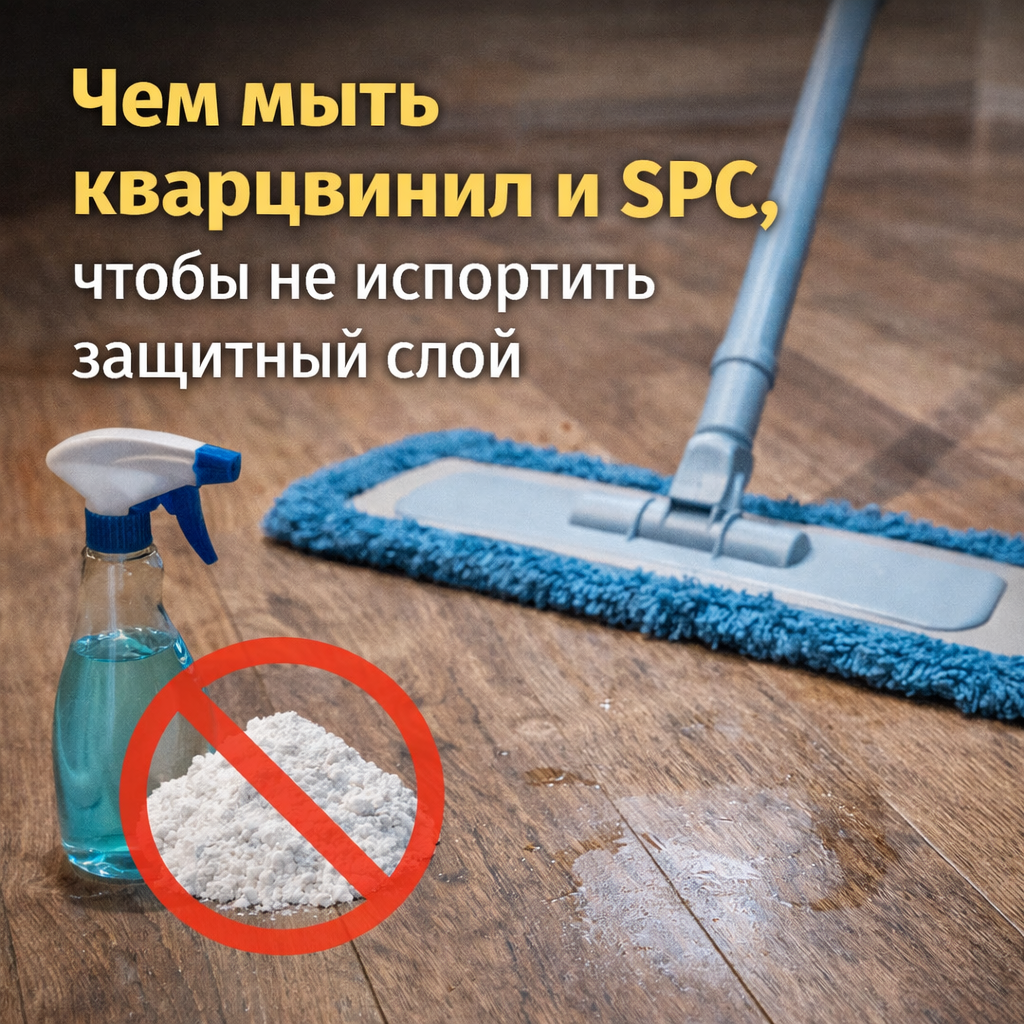 Но многие проблемы с внешним видом появляются не из-за износа, а из-за неподходящей уборки. Пол начинают мыть тем же, чем моют плитку или кухню, и через время появляются: Разберёмся, чем действительно можно мыть такие покрытия, а чего лучше избегать. Для кварцвинила и SPC подходит максимально простая схема. Основной набор: Важно, чтобы средство было без агрессивных компонентов. Такая уборка не повреждает защитный слой и не оставляет налёт. Если использовать бытовую химию, лучше выбирать средства: Такие составы не создают плёнку на поверхности и не меняют внешний вид покрытия. Есть несколько вещей, которые чаще всего портят поверхность. Не рекомендуется: Они могут постепенно разрушать защитный слой или оставлять матовые пятна. Иногда используют полироли или средства для придания блеска. Проблема в том, что такие составы: Большинство современных покрытий не требует дополнительного блеска. Правильная уборка выглядит проще, чем кажется