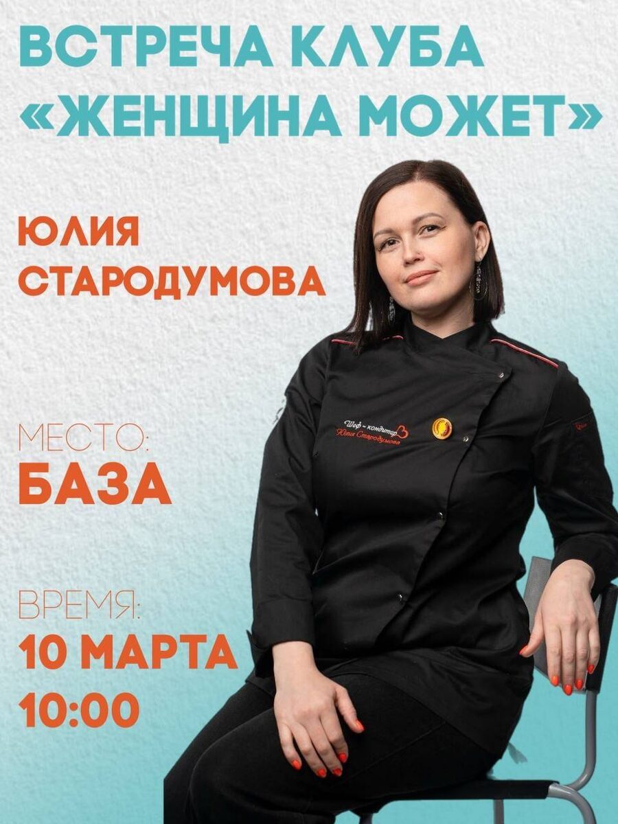 Деловой женский клуб Женщина может приглашает на встречу с кондитером Юлией Стародумовой. Тема: построение личного бренда через участие в масштабных мероприятиях. Обсуждение целей, преодоления страхов и достижения результатов. Начало: 10 марта 2026 10:00 Стоимость: Бесплатно Адрес: г Омск, ул Шебалдина, д 60 Организатор: https://vk.com/public199848832 ⭐️ Милые дамы, приглашаем на встречу делового женского клуба «Женщина может» ⏳ Время: 10 марта, 10:00 ⬇️ Место: БАЗА, Шебалдина 60, 3 этаж ✅ Куратор клуба: Юлия Асабина — основательница центра развития для детей «БАЗА». ✅ Приглашенный гость: Юлия Стародумова — профессиональный кондитер, владелица именной студии «Мастерская сладостей». Тема: «построение личного бренда через участие в... #бизнес_бизнес Узнать подробности, адрес или записаться на событие.