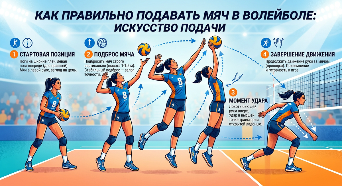 В волейболе существует несколько видов подач, которые различаются техникой выполнения, сложностью и тактической целью. Их можно разделить на две основные категории: нижняя и верхняя. Нижняя подача