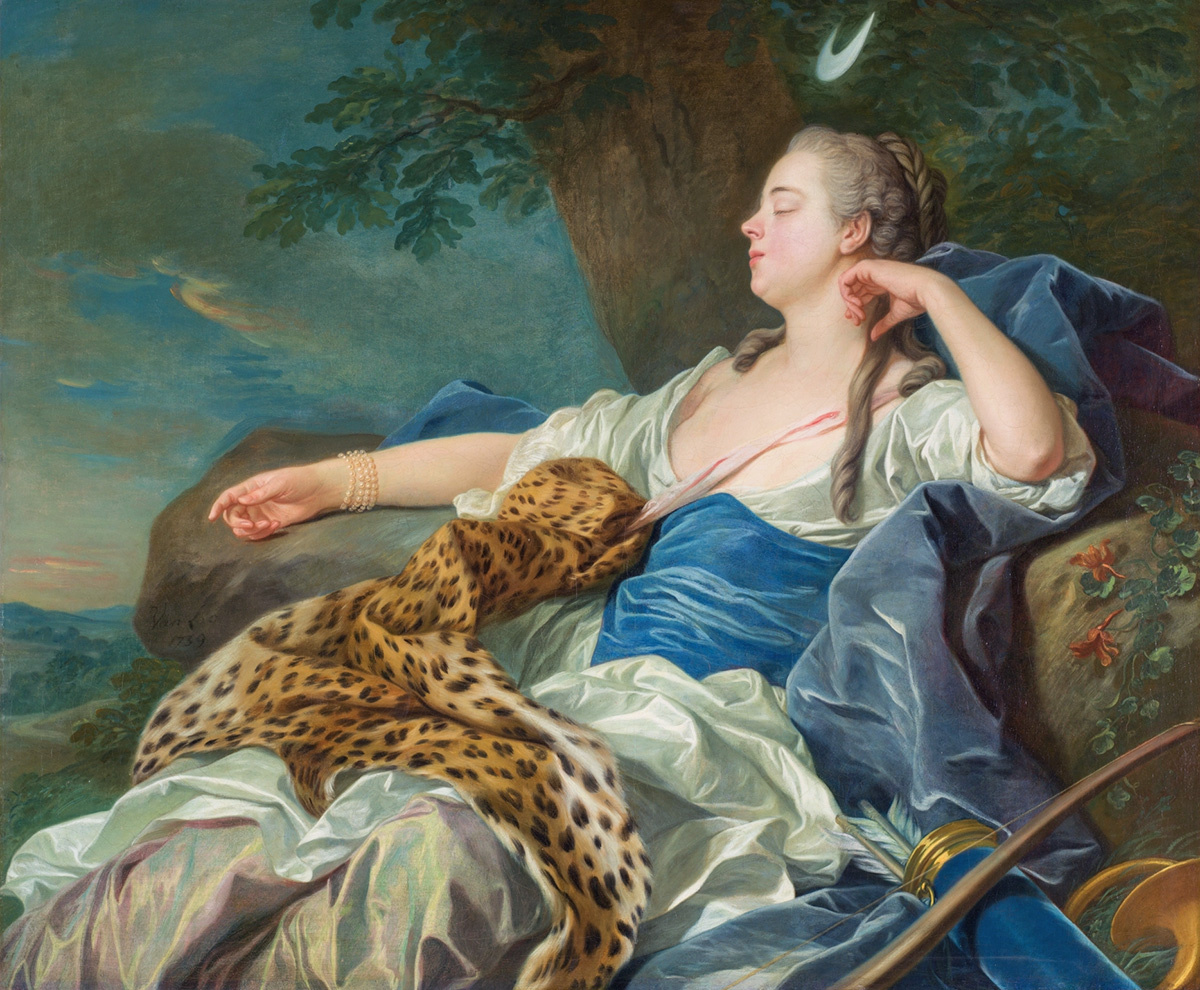 Римская богиня Диана спит, одетая в типичное для неё одеяние, с мантией и шкурой леопарда. Рядом с ней лежит колчан со стрелами, лук и охотничий рог, а над её головой в темноте сияет полумесяц, представляя её также и богиней луны. Картина изображает один из самых изысканных и утонченных мифологических образов XVIII века. Это не портрет, поскольку нет стремления индивидуализировать Диану; её черты универсальны, хотя и очень красивы. Контраст света и тени, тщательная и детальная проработка предметов, а также жемчужные тона телесных оттенков — все это способствует созданию гармоничного и выразительного произведения с мастерским эстетическим и декоративным результатом. На этой картине французский художник Луи-Мишель ван Лоо (1707-1771) мастерски показывает уроки, которые он усвоил, а также свои познания в итальянской живописи, почерпнутые им во время путешествий, и то время, которое он провел в Парижской академии. Согласно дате рядом с подписью, картина была написана в 1739 году в Испа