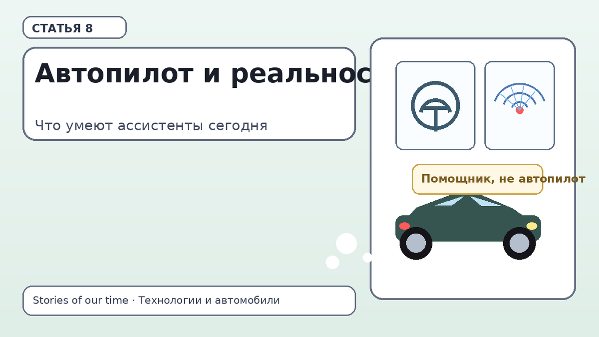 Но в повседневной жизни большинство современных машин пока не “едут сами”, а помогают водителю ехать спокойнее. И это очень важная разница. Да, технологии шагнули далеко: