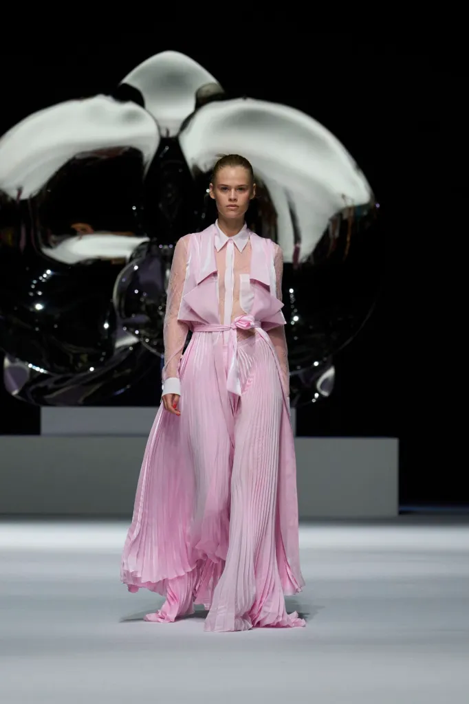 Этот наряд — не просто платье, а оммаж красоте природы, воплощённой в женской одежде. Он демонстрирует, как идея изгибов орхидеи трансформировалась в скульптурные силуэты коллекции Genny SS26, где каждая линия, каждый складкой наполнен смыслом и эстетикой. Образ одновременно игривый и утончённый, он воплощает идею коллекции: феминность как сочетание нежности и силы, чувственности и грации.