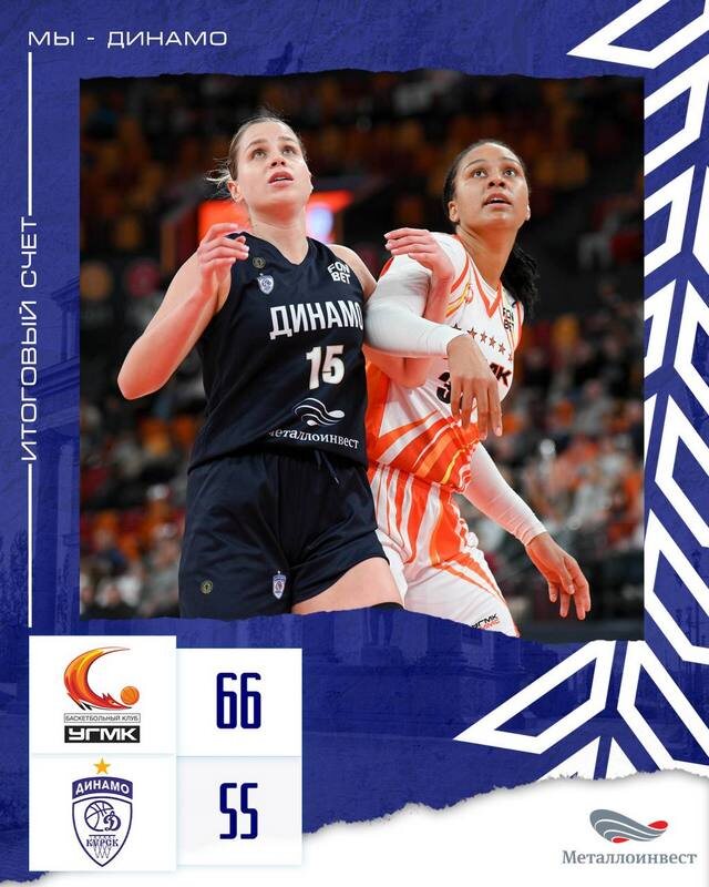 Вечером 4 марта баскетболистки «Динамо» (Курск) провели заключительную встречу второго раунда «регулярки», заняв второе место в женской премьер-лиге. В Екатеринбурге подопечные Александра Ковалева уступили победителю турнира — УГМК со счетом 55:66 (17:17, 15:16, 13:10, 10:23). Игра лидеров ничего не решала в турнирном положении. УГМК досрочно занял первое место, курянки стали вторыми. Но было интересно. Поединок полчаса шел на равных, как говорят, в баскетбольных качелях. После ничейной стартовой четверти «уральские лисицы» на одно очко опережали курянок к большому перерыву — 32:33. А к исходу третьего периода перевес в один средний бросок имели гостьи — 45:43. Решающим стал 4-й отрезок матча, в котором команда Дмитрия Донскова оформила победу «плюс 11». Ударную тройку Курска составили Ольга Фролкина — 18 очков, Киара Линскенс — 11 и Вероника Сазонова, которой чуть-чуть не хватило до дабл-дабла — 9 + 10 подборов. 23 победы, 4 поражения и 50 очков — с таким багажом динамовки входят в пл
