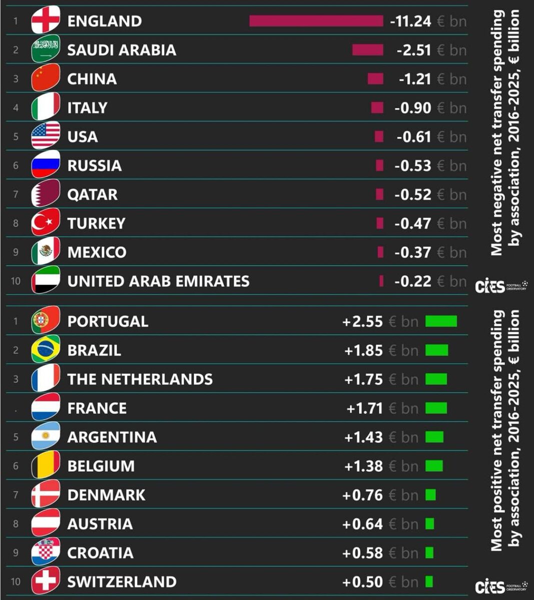 : ⏺ Мы 6 в рейтинге среди транжир. За 10 лет минуса больше полу миллиарда. Умудрились обойти и Катар и даже Турцию с их сверх тратами на топовых игроков. Все списать на «Спартак» не получится. Это все же коллективное творчество. Не стоит забывать про наши реалии и уходы игроков бесплатно. Это тоже дало дополнительный минус. Ну а Англию не перекроет никто. Там золотая лихорадка. Лучше всех с балансом у португало-говорящих. Дальше Нидерланды 🇳🇱, Франция 🇫🇷и Аргентина 🇦🇷 ➡️✈️🌟🌟🌟🌟🌟🌟 🤩