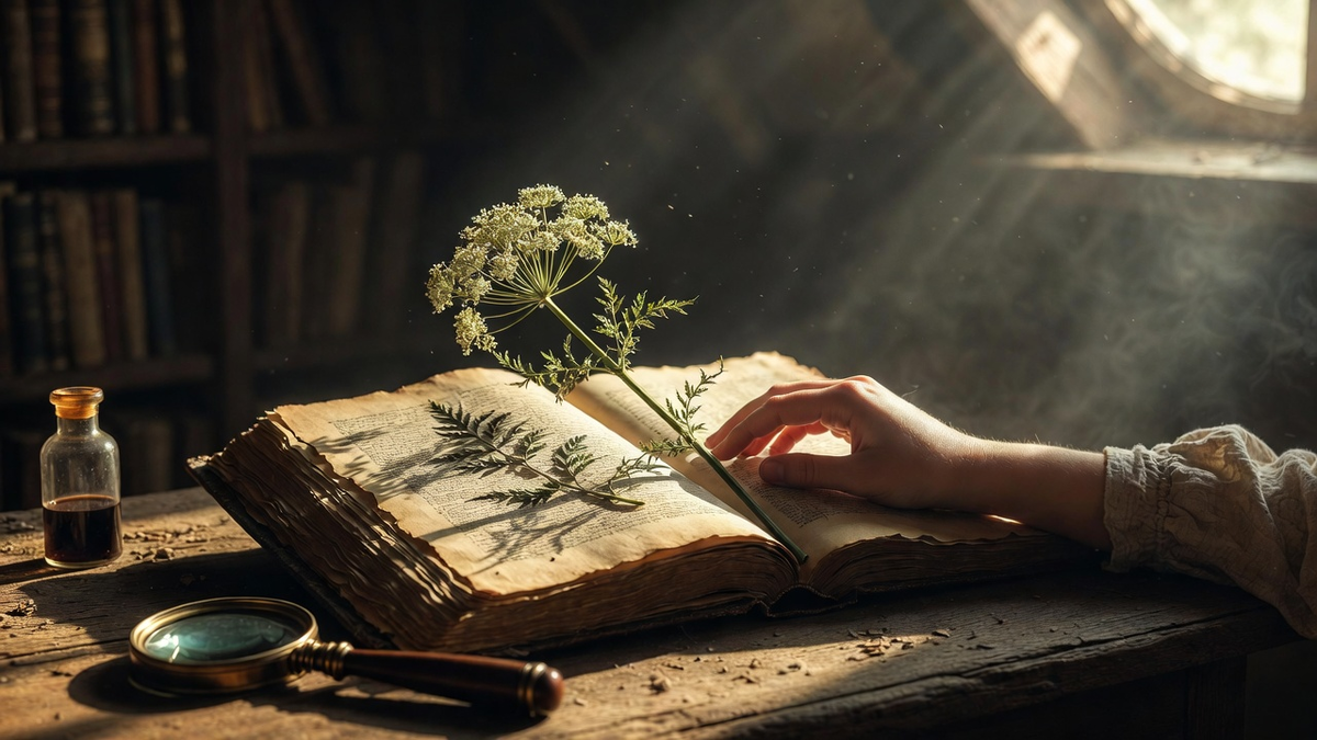 Я вернулась в свою лабораторию на чердаке, чтобы спрятать газетную вырезку и мамин платок. Руки дрожали после разговора с дедом Матвеем. Мысли путались. Фигура в лесу, серёжка у пруда, убитый Полонский... Всё это не складывалось в единую картину, но я чувствовала — связь есть. Я открыла шкаф, где хранила самые ценные гербарии, и вдруг замерла. Между страницами старого ботанического атласа, который я взяла в библиотеке неделю назад, торчал незнакомый лист. Я точно его туда не клала. Я осторожно извлекла лист. Это был гербарий, засушенный много лет назад — бумага пожелтела, стала хрупкой. На листе — веточка с мелкими белыми цветами и подпись каллиграфическим почерком: «Conium maculatum. Болиголов пятнистый. Собран в саду усадьбы "Медовое". Июль 1998». Я похолодела. Это был мамин почерк. Те самые круглые буквы с наклоном влево. И дата — лето девяносто восьмого. За месяц до убийства Полонского. За два месяца до исчезновения мамы. Болиголов. Самое ядовитое растение в наших краях. Древние гр