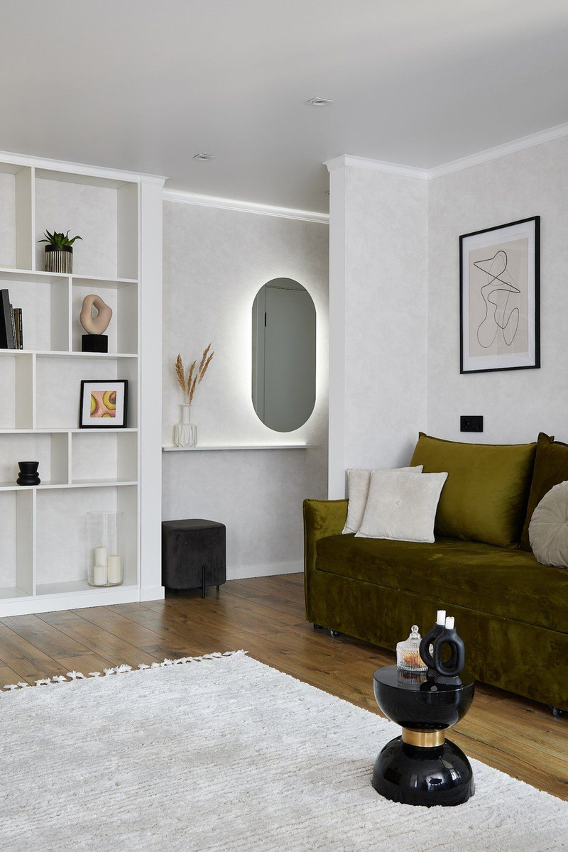 - Цветовое зонирование стен. Стена вдоль прохода — нейтральная (белая, серая). Стена в жилой зоне — акцентная (цветная, с обоями, с декором). Это визуально разделяет пространство, делает жилую зону более выразительной, уютной.