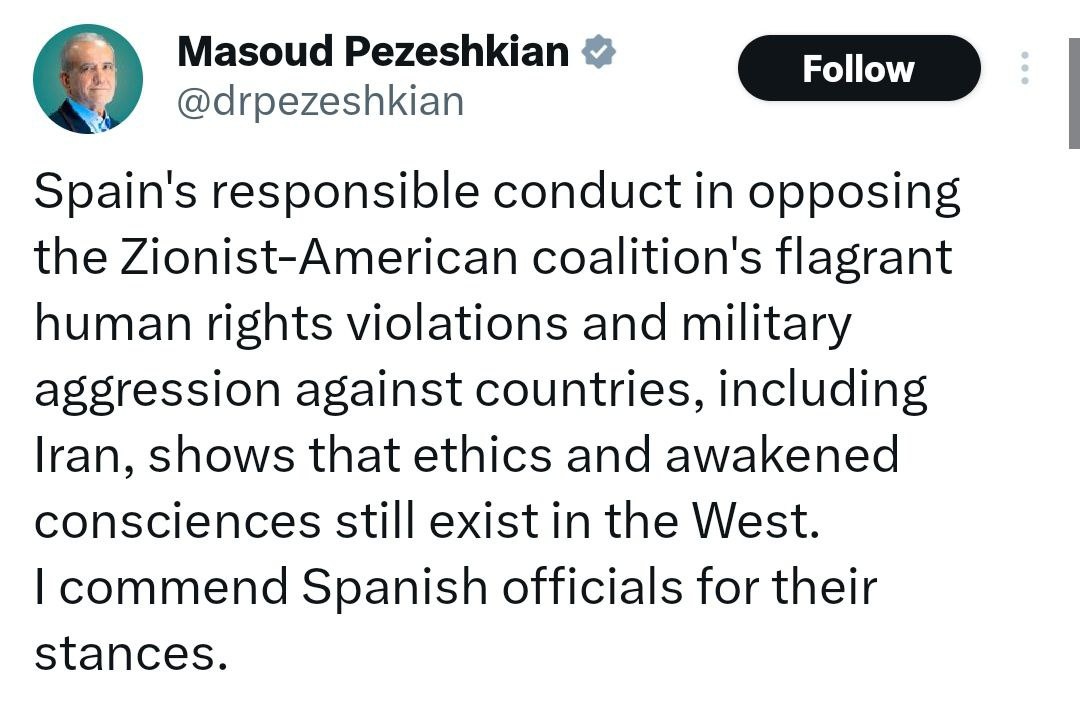Iran's Prez Pezeshkian: 'Spain's responsible conduct shows ETHICS and awakened consciences still exist in West'