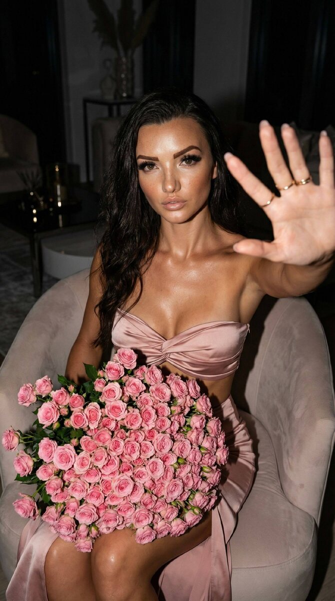 !🫷 А ты уже поучавствовал в розыгрыше? Поторопись 😉 Ultra-realistic fashion portrait of a glamorous woman sitting in a modern interior at night, cinematic dark environment with minimal elegant decor, contemporary luxury social editorial aesthetic. Medium shot, camera positioned slightly above and close, strong high-angle perspective. She sits on a soft armchair, holding a huge bouquet of small pink roses (around 400–500 stems) in one arm. Her other hand is reaching toward the camera, fingers slightly extended, creating depth and interaction. Makeup: glowing bronzed skin with wet highlight, dramatic fox-eye eyeliner, very long fluffy lashes, glossy nude lips. Hair: long loose waves, slightly voluminous. Styling: strapless satin blush-pink top with twisted detail at the bust, matching flowing satin skirt, minimal gold rings and jewelry. Lighting: strong direct flash, bright subject with deep shadows behind, glossy skin and fabric texture emphasized. Shot on professional full-fr