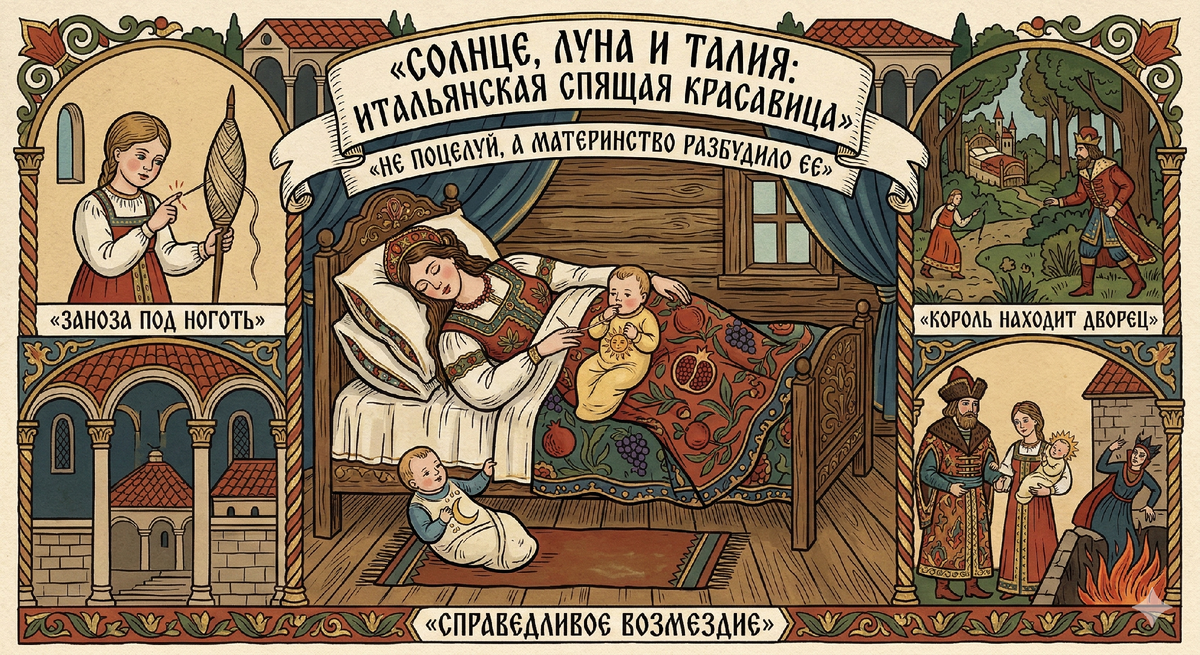 Когда я впервые прочитал оригинал «Спящей красавицы» Джамбаттисты Базиле 1634 года, я понял, что наше привычное представление об этой сказке — лишь верхушка айсберга. В этой статье я проведу вас по темным лабиринтам итальянского барокко, где мой анализ сказки «Солнце, Луна и Талия» раскрывает пугающие истоки европейского фольклора. Мы исследуем, почему пробуждение героини связано с биологией, а не с поцелуем, и как древние архетипы плодородия, магия льна и мифология Неаполя XVII века превратили историю Талии в сложный философский трактат, который разительно отличается от приглаженных версий Перро и братьев Гримм.