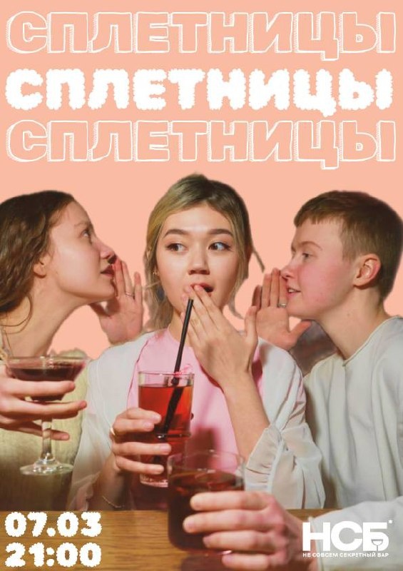 🌺 Всем предпраздничный привет! 8 марта отмечается Международный женский день, и мы искренне хотим поздравить вас, милые дамы, с вашим днём В честь вас 7 марта в НСБ пройдёт вечеринка в нежной стилистике «Сплетниц» Обсудим всех и вся, потанцуем под любимые песни - никто не останется без внимания, мы гарантируем! 💐 Ждём в НСБ 7 марта в 21:00 обсуждать все последние сплетни, пить коктейли и отдыхать с самыми близкими людьми Бронируй столик по ссылке ❤️ Ул. Розы Люксембург 8 | 10 8 (912) - 034 - 28 - 6