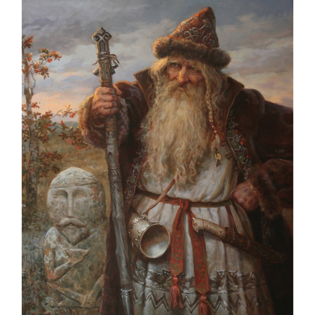 В окружающем сумраке почти ничего не видно, лишь в центре поляны едва заметно светиться столб с покатой или округлой вершиной… Я делаю шаг на саму поляну…, и в мгновение ока все проявляется в своей четкой видимости… Трава наливается соком жизни и зеленеет, ели, окружающие поляну, скидывают сумеречное обличье и предстают во всей своей зеленой величавости… Столб посреди поляны преобразился – на нем стал ясно виден вырезанный лик и весь он приобрел четкую монументальность. Какой-то дикой, необузданной и первородной силой прянуло от него…