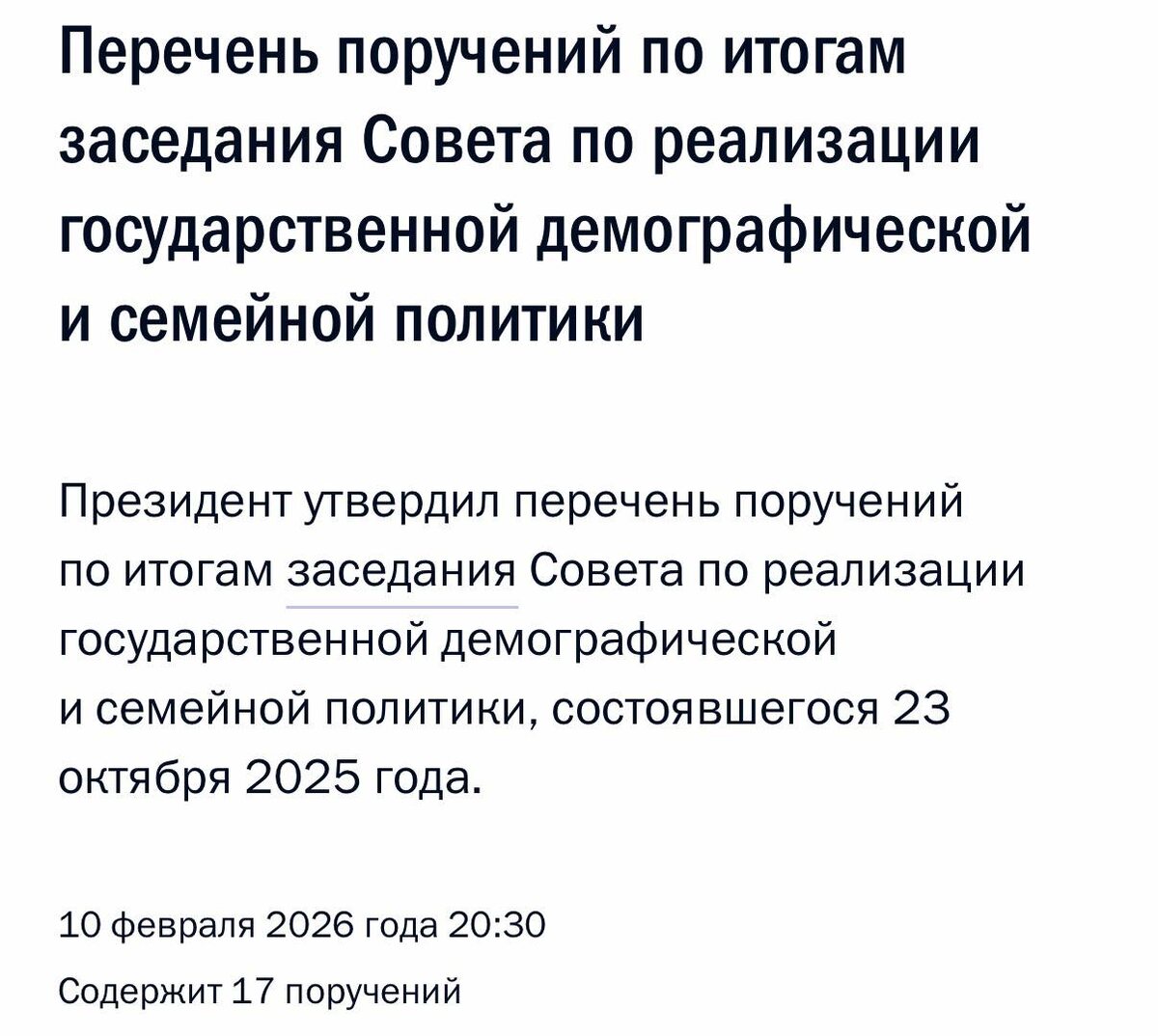 Обратите внимание на пункт 4 и срок его исполнения — до 1 июня 2026 года. 4. Правительству Российской Федерации подготовить совместно с исполнительными органами субъектов Российской Федерации, Банком России и акционерным обществом «ДОМ.РФ» и представить предложения по совершенствованию государственных программ по обеспечению жильём семей, имеющих детей, в том числе: а) по первоочередному улучшению жилищных условий семей, имеющих детей в возрасте до семи лет; б) по обеспечению возможности перехода семей из одной государственной программы в другую по мере увеличения количества детей в семье; в) по дифференциации ставки по льготной ипотечной программе в зависимости от количества детей в семье; г) по улучшению жилищных условий семей с детьми, не имеющих собственного жилья, путём развития льготной аренды жилья для таких семей. Срок — 1 июня 2026 г. 📱Думайте сами — решайте сами. Для решительных оставляем контакт для связи P.S. Если у вас пока один ребёнок - самое время использовать