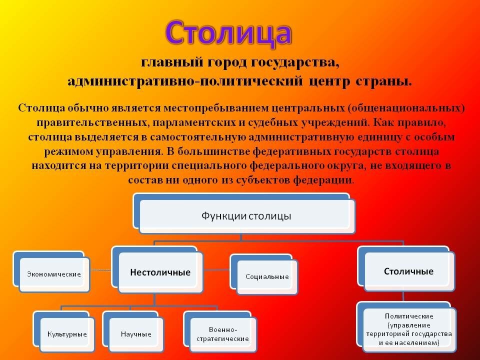 В столице могут сочетаться функции столичные (политические) и нестоличные (экономические, культурные, административные и др.). Главным отличием политической столицы от любого крупного экономического и/или культурного центра является выполнение столичных функций — управление территорией государства и его населением. В столицах, как правило, размещаются институты трех главных ветвей государственной власти — законодательной, исполнительной и судебной. Таким образом, столица является главным центром государственного управления страной. Столицей может быть любой город, обладающий выдающимся политико-географическим или экономико-географическим положением: небольшой город с центральным или серединным положением, крупнейший экономический центр, большой город, главный культурный и интеллектуальный центр страны, исторический город — символ нации или город, заново построенный специально как столица. Есть страны, где столиц нет вообще (на острове Науру, в Токелау и Ниуэ).