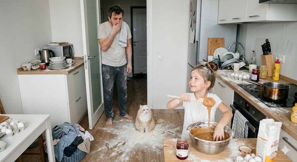 — Катюш, — Игорь присел на корточки рядом с дочерью, стараясь не вдыхать облако муки. — Давай так. Торт мы сделаем вместе, но по рецепту. А сначала... сначала мы спасем квартиру.