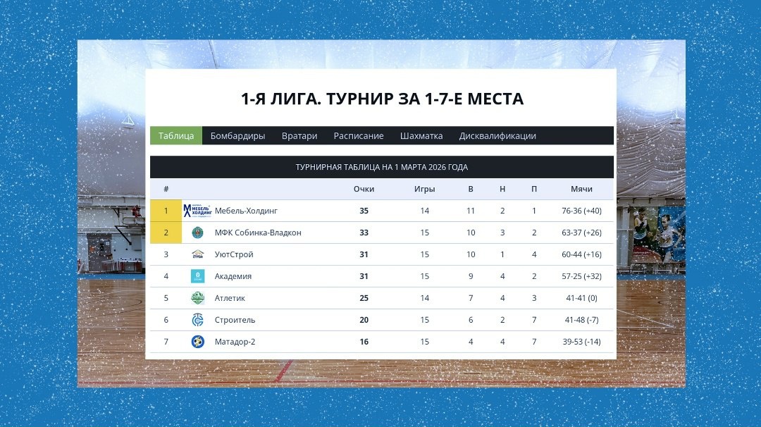 Турнир за 1-7-е места. 📅 Турнирная таблица на 1 марта 2026 года. ⚔ Мебели-Холдинг и МФК Собинка-Владкон разошлись миром (3:3) в очной схватке за первую строчку таблицы. 🆚 УютСтрой и Академия сделали выводы из предыдущих поражений, выиграли свои матчи (у Матадора-2 и Строителя соответственно) и не отпускают друг друга в борьбе медали. https://befutsal.ru/league.php?l=224668601