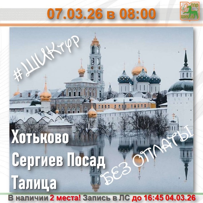 8.00 отъезд от Собора Московских святых в Бибиреве, ул.Костромская, вл.7 8.00-9.30 путевая информация 9.30 Хотьково, посещение родителей преподобного Сергия 10.30 прибытие в Сергиев Посад, обзорная экскурсия по Лавре 11.30 ЦАК 12.30 обед 13.30 свободное время 14.00 отъезд из Лавры 14.30 прибытие в Талицы, экскурсия по подворью Стефано-Махрищенского монастыря и Пещерный Храм 16.00 вечерняя служба 16.30 отъезд в Москву 💥 Осталось 1 место #ШИКтур
