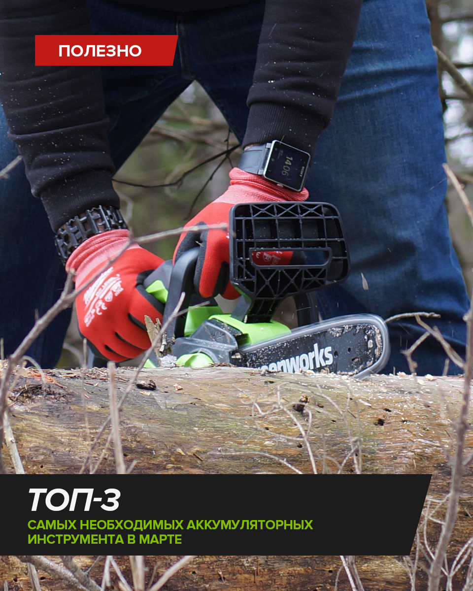 Топ-3 самых необходимых аккумуляторных инструмента этой весной Весна — время обрезки деревьев, ухода за живой изгородью и подготовки участка. В линейке Greenworks POWERALL 24V есть всё, чтобы закрыть эти задачи одной аккумуляторной платформой. Высоторез Greenworks G24PS201 (1402607) — для подрезки веток без лестницы. 3-секционная штанга до 270 см позволяет работать на высоте до 3,8 м. Шина 20 см, автоматическая смазка цепи, защита от перегрузки. Приобрести можно в онлайн и офлайн-магазинах: Ozon: https://vk.cc/cV4yEO