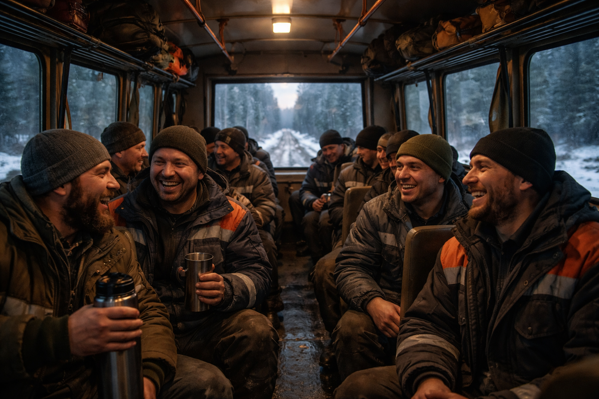 Первые часы ехали бодро: шутили, спрашивали, кто откуда, у кого какая специальность. Кто-то сразу достал термос, кто-то — телефон, будто связь тут будет всегда.